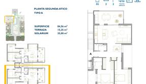 Apartamentos en planta baja con jardín privado y áticos en planta alta con solarium privado.