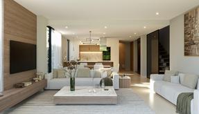 Todas las villas tienen 3 dormitorios, 2 o 3 baños, cocina americana con salón, armarios empotrados, aire acondicionado y aerotermia, cocina equipada, jardín privado con piscina y parking.