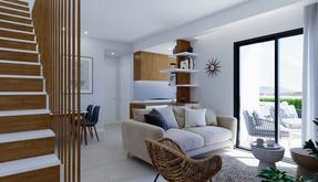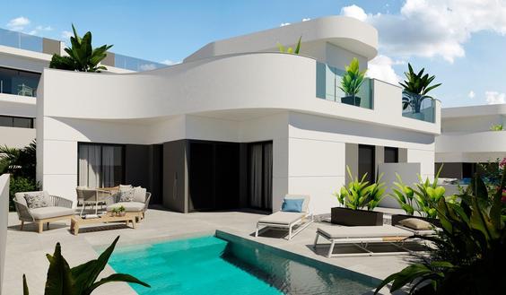 villa pareada de obra nueva con 3 dormitorios, 2 baños, cocina americana con amplio salón, armarios empotrados, jardín privado con piscina y plaza de aparcamiento exterior, solarium privado.