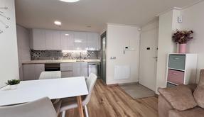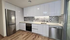 This Torrevieja bungalow’s living room acts as a hub for social gatherings, graced by ample windows that invite in the stunning Mediterranean sun. The kitchen area, meanwhile, is elegantly designed to cater to all culinary needs—an ideal space for those who love to cook and entertain.