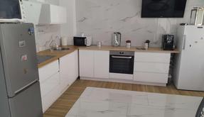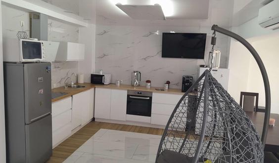 Просторная гостиная органично связана с кухонной зоной, создавая единое пространство для семейных встреч и дружеских вечеринок. Современная кухня оснащена всем необходимым оборудованием и мебелью, что позволяет комфортно и легко готовить.