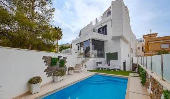 Роскошная вилла с бассейном в тихом месте рядом с полями для гольфа, Лас Филипас, Ориуэла Коста, Испания — это предложение для тех, кто ценит спокойную атмосферу жилого района Las Filipinas и удобный доступ к инфраструктуре Ориуэла Коста на побережье Коста-Бланка.
