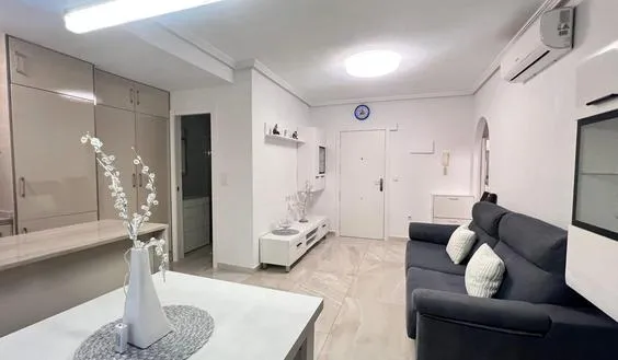 Renoverad lägenhet i Playa del Cura-området i Torrevieja, beläget längs Costa Blancas kust i provinsen Alicante, Spanien. Fastigheten finns på femte våningen i ett bostadshus med hiss. Den totala bostadsytan är 70 kvadratmeter. Planlösningen omfattar två sovrum, ett badrum, ett vardagsrum-matsal och ett kök. Lägenheten är fullt möblerad och utrustad med luftkonditionering.