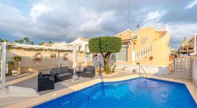 For those warm summer afternoons, the villa's swimming pool provides a refreshing retreat. Whether for laps, leisure, or kids’ play, the pool is a standout feature of this Orihuela Costa real estate offering. Additionally, the villa is equipped with air conditioning throughout, providing a comfortable living environment even during the peak of summer heat.
